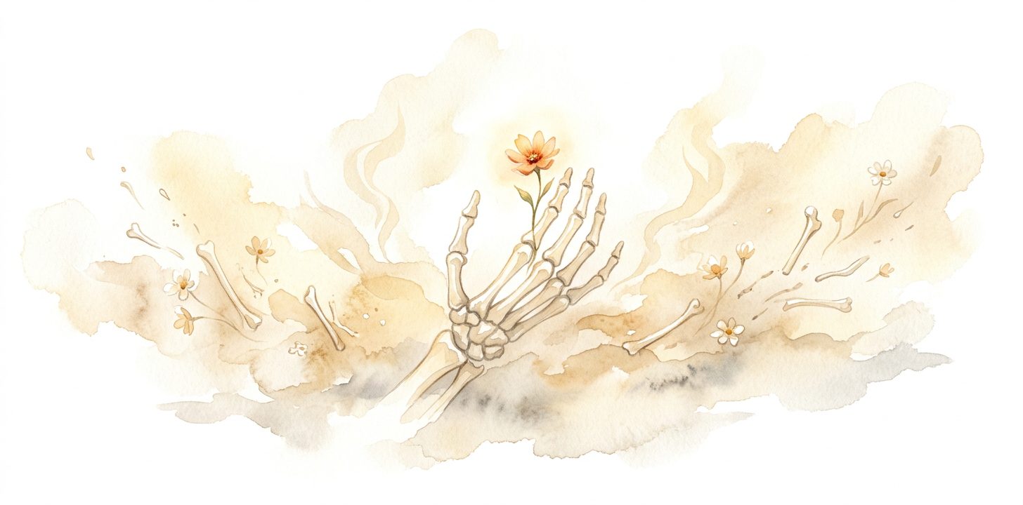 Pero los huesos son también lo que queda tras la muerte. Por eso, en todas las culturas, encierran un doble simbolismo: el apoyo de la vida y el recordatorio de la mortalidad. El esqueleto en la simbología occidental no es solo el miedo a la muerte, sino también un «memento mori», un recordatorio de nuestra finitud. En la tradición mexicana del Día de los Muertos, los huesos son una fiesta, no un luto. En las tradiciones chamánicas, los huesos de los ancestros portan poder.